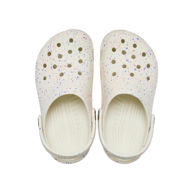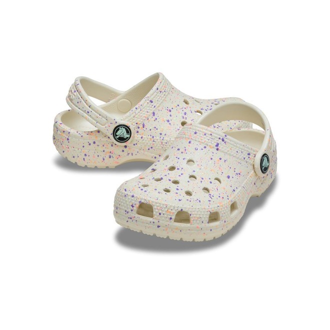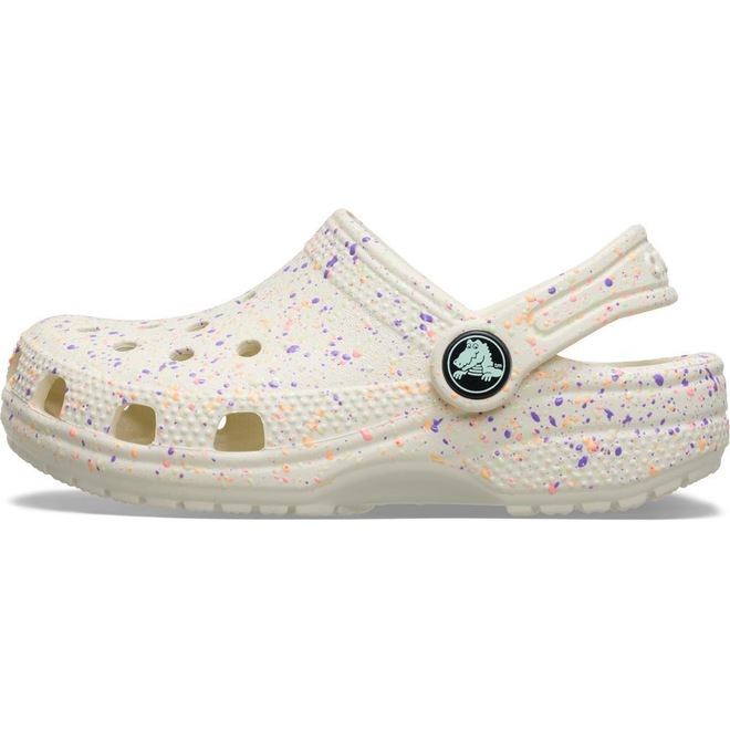 Dias claros, noites radiantes, crianças felizes. Os Clogs Crocs com respingos de tinta que brilham no escuro trazem um toque divertido e criativo à silhueta icônica dos Crocs, com um design ousado e artístico. Leves, fáceis de calçar e feitos para crianças que adoram brilhar do seu jeito. Conforto em primeiro lugar, personalidade radiante.