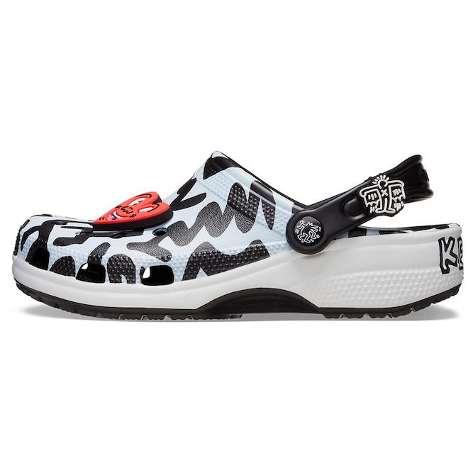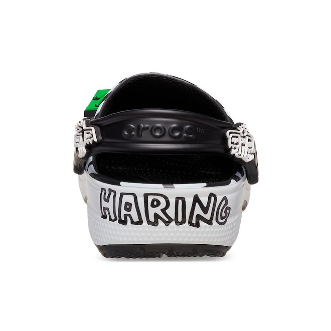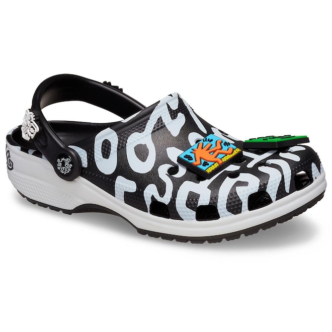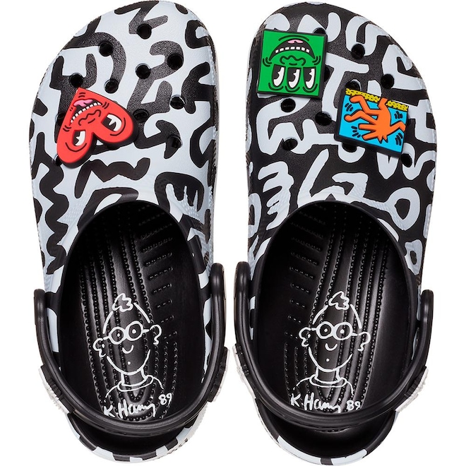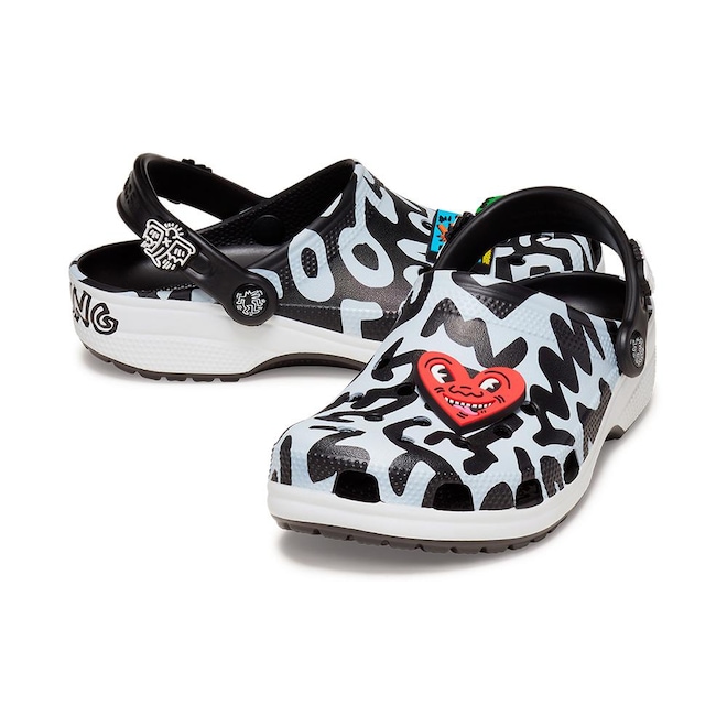 Três amigos dos anos 80, uma coleção icónica de clássicos. Keith Haring, Jean-Michel Basquiat e Kenny Scharf casam lindamente seus estilos artísticos inspirados em suas raízes do hip hop, ambientes urbanos e no movimento Pop Art para criar quatro Clogs ousadas que só esses reis certificados da arte de rua conseguem. De cores vibrantes e metálicas a solas ultraplataformas e Jibbitz grandes, cada estilo é um item de colecionador que você deseja exibir e usar. Keith Haring Foundation. Licensed by Artestar, New York. Detalhes do Classic Crocs: Incrivelmente leve e divertido de usar Amigável à água e flutuante; pesa apenas onças As portas de ventilação proporcionam respirabilidade e ajudam a eliminar água e detritos Fácil de limpar e rápido de secar Tiras giratórias no calcanhar para um ajuste mais seguro Personalizável com Jibbitz Iconic Crocs Comfort: Leve. Flexível. Conforto de 360 graus.