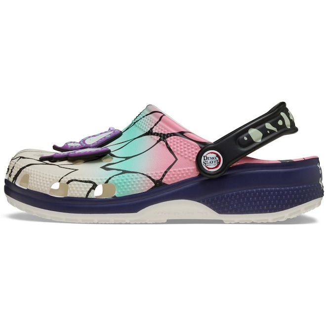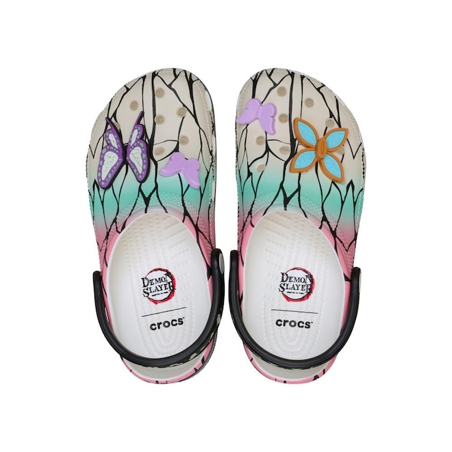 - Sobre o produto - O Shinobu Classic Clog, da coleção Demon Slayer, incorpora a força e a serenidade da Hashira Inseto com este estilo etéreo. Estes clogs de edição limitada apresentam uma coloração degradê de rosa, azul-petróleo e creme, com detalhes em relevo como as veias das asas de borboleta, que lembram o manto kochou de Shinobu. O Shinobu Classic Clog é adornado com charms Jibbitz, incluindo seu tsuba de trevo de quatro folhas e charms de borboleta.