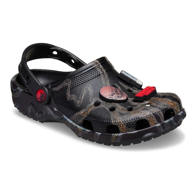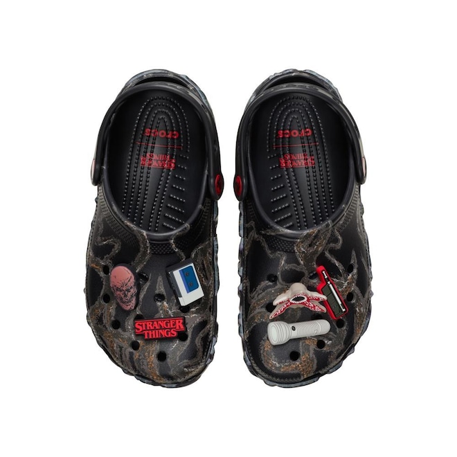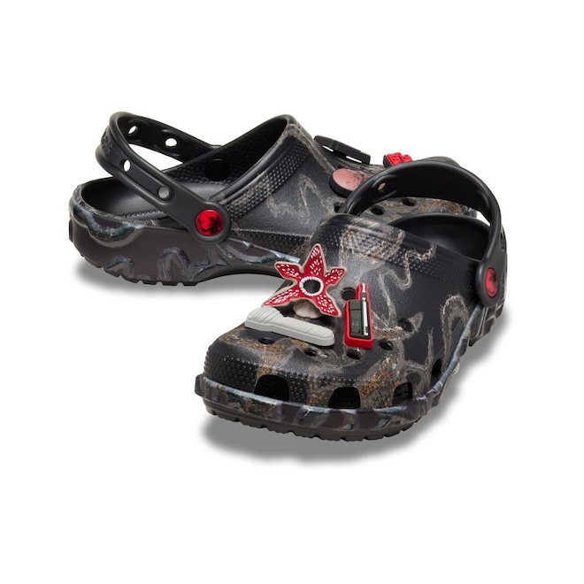 O Mundo Invertido transformou o Clog Clássico. Esta silhueta quase senciente apresenta gráficos espectrais do Devorador de Mentes que envolvem a parte superior e o calcanhar, dando vida a essa criatura sombria. Uma coleção de seis Jibbitz, incluindo um rosto 3D do Demogorgon, uma lanterna, um walkie-talkie, o rosto de Vecna e muito mais, fica na parte superior, além de bastante espaço para adicionar seus outros acessórios favoritos. Prepare-se para entrar em uma dimensão paralela com este par assombroso.