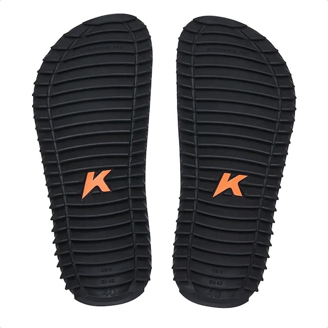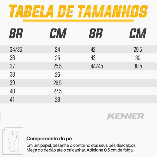 Cabedal tridimensional em gel com revestimento interno em neoprene preto que evita o atrito com a pele Palmilha lixada de eva expandido, com arte de palmilha em laser Identificadores com K dourado vazado e "KENNER" de metal também no dourado na lateral do solado Solado tratorado de borracha vulcanizada