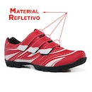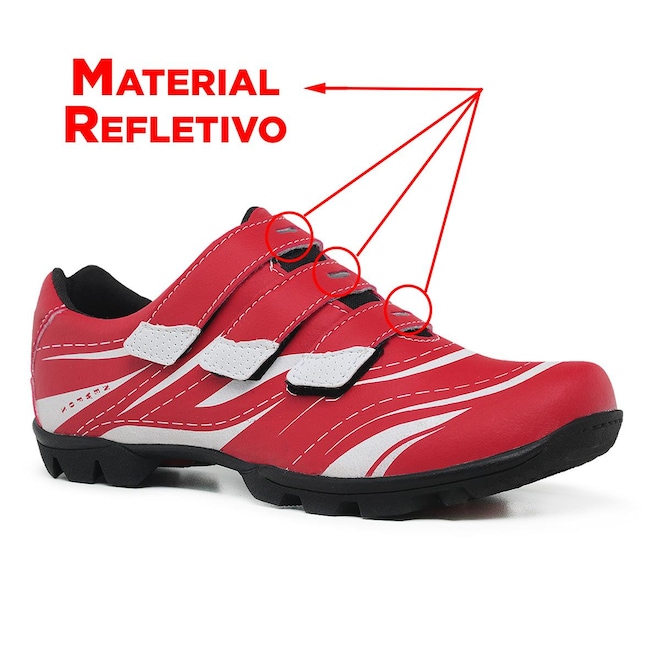 Sapatilha fabricada em couro sintético com partes internas em tecido/malha mesh, permitindo pedalar com muito mais conforto sem perder o foco no desempenho. Solado em borracha macia produzida com o emprego de diferentes tecnologias aderentes ao pedal, desenvolvido exclusivamente para pedalar, testado e aprovado por 97,6% dos usuários do modelo. Oferece maior durabilidade contra a umidade por ser fabricado com uma entressola semi-impermeável. Melhora no desempenho contra pequenos impactos, além de gerar menor torção e minimizar a perda da energia transmitida para os pedais. Oferece a opção de poder deixar a bicicleta e caminhar comodamente. Indicada para amadores e entusiastas, por seu conforto e robustez, é a sapatilha perfeita para melhorar sua performance no pedal. Fechamento com 3 tiras aderentes, fácil de calçar.