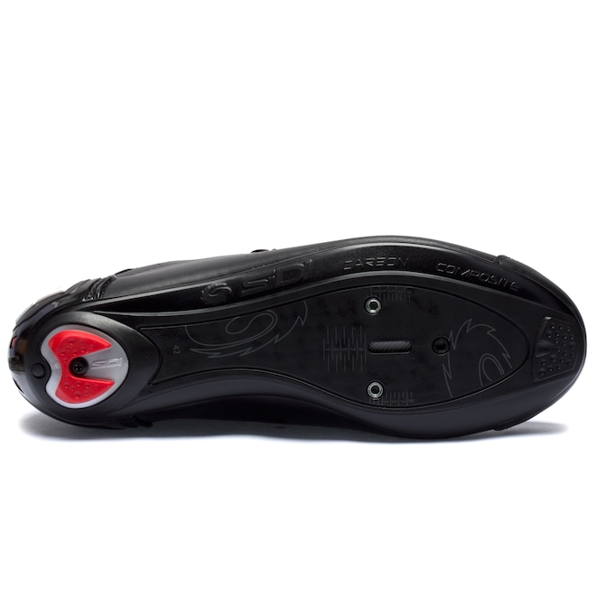 Já o solado em composite de carbono é projetado para maior durabilidade contra a mudança das condições climáticas e efeito do tempo com parte central graduada em escala de mm para facilitar o encaixe dos tacos.