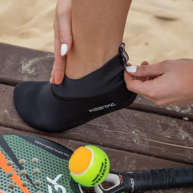 A Meia para Beach Tennis Kestal foi desenvolvida para a prática de esportes de areia, exercícios de solo, corridas e caminhadas em superfícies planas.