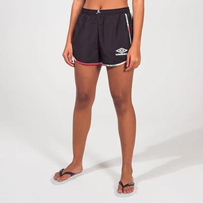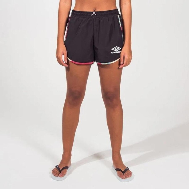 Shorts feminino com cós em elástico e cordão interno para melhor ajuste, confeccionada em tecido leve, possui bolsos laterais, barra e acabamento lateral em viés, recorte lateral com 7 cm (arte sublimada no vivo somente na cor preta) e logo Umbro estampado na parte frontal inferior esquerda.