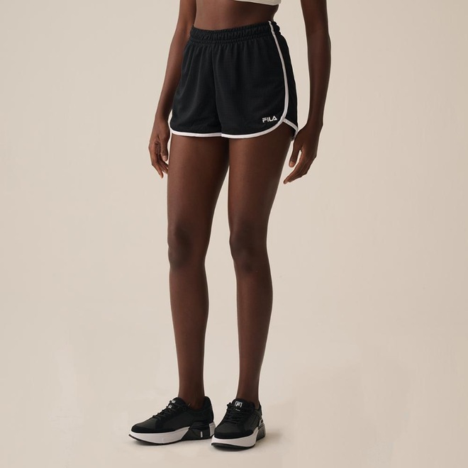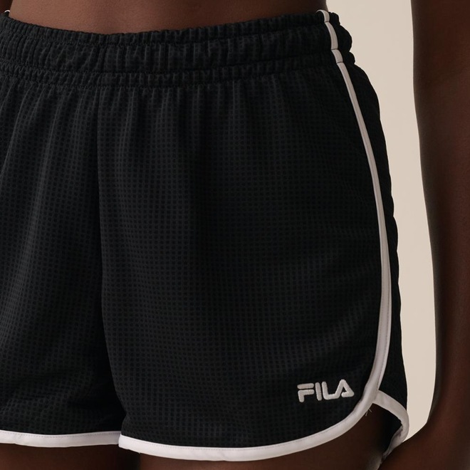 Short feminino confeccionado em malha microperfurada 100% poliéster. Modelagem regular com cós elástico tombado de 4 cm e barras laterais assimétricas. Seu tecido contém a tecnologia FLOW, que oferece secagem rápida e respirabilidade. Possui cordão de ajuste com amarração interna no cós, barra e laterais em viés contrastante e logo Fila Letter bordado na lateral esquerda próximo à barra. Comprimento total: 34 cm.ref: M17M6M