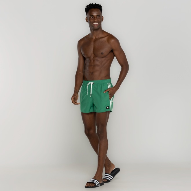 Um estiloso modelo com comprimento mais curtinho para você performar nos treinos aquáticos, o Short Masculino adidas Natação 3 Listras é feito com a leveza do poliéster, possui sunga interna para mais suporte, além de cós elástico ajustado por cordão.