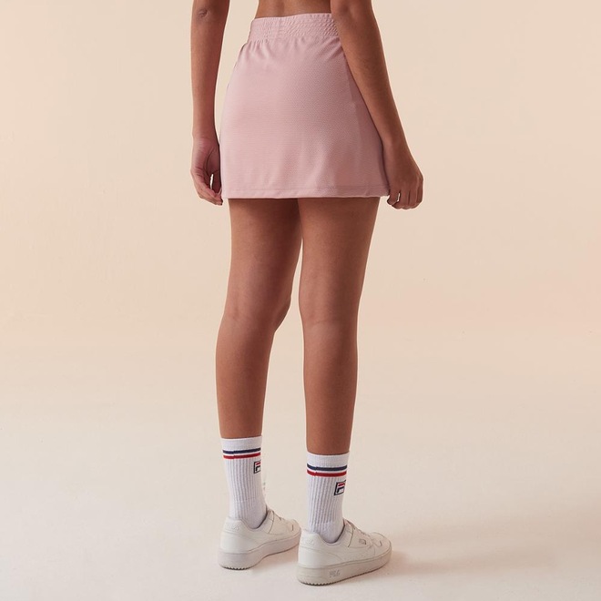 Saia skorts feminina confeccionada em malha de poliéster com tecnologia FLOW, que traz maior respirabilidade e UV PROTECTION FPS 50+. Em modelagem curta e regular, possui shorts interno com gusset, bolso lateral e cós tombado de 5,5 cm. Ideal para atividades de baixa intensidade e perfeita para compor looks pós-esporte. O detalhe do FILA Linear em silicone aplicado na barra esquerda adiciona um toque de autenticidade à peça.