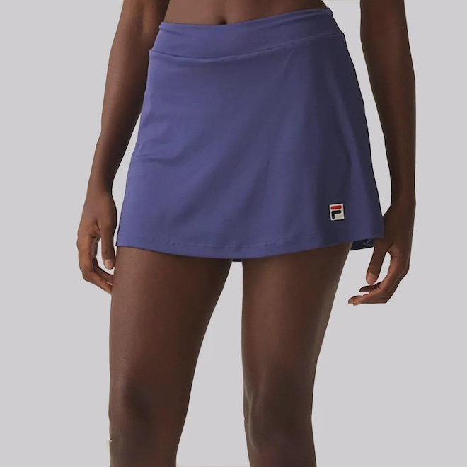 Saia shorts feminina desenvolvida com poliéster reciclado. A peça traz as tecnologias UV PROTECTION (proteção solar FPS 50+) e FLOW (mantém o corpo na temperatura ideal). Possui cós com elástico e shorts interno com bolsos para bola de Tennis. A assinatura da marca aparece com o patch F-Box na parte frontal. Comprimento: 36 cm.
