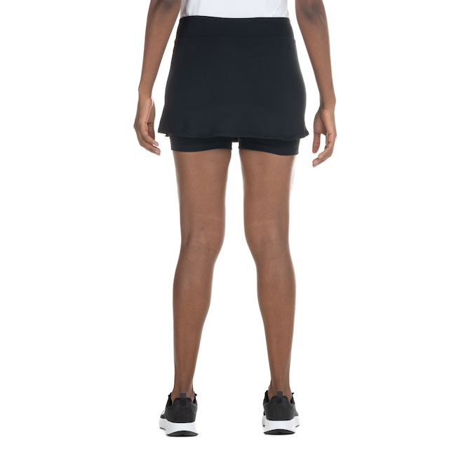 O short saia é em elástico, com cintura média e short interno oferecendo maior proteção durante as atividades.