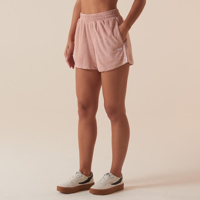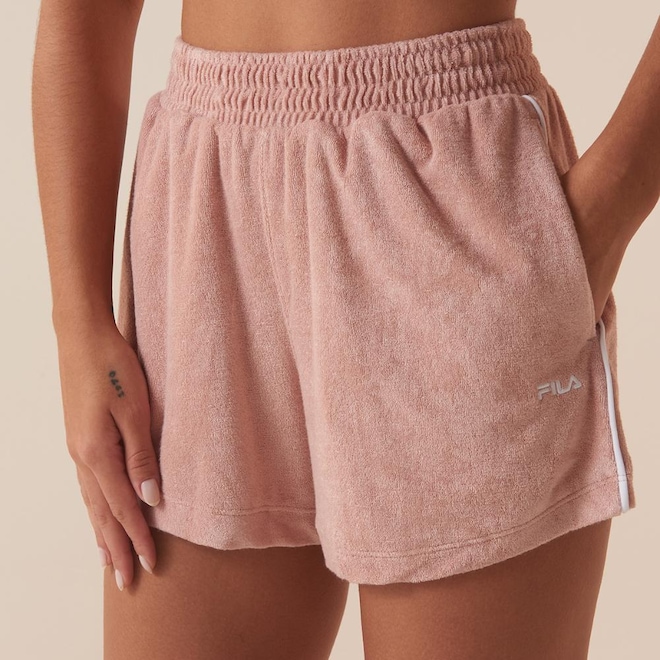 O Shorts Feminino FILA Comfort Soft II possui modelagem regular em malha atoalhada, oferecendo conforto e textura diferenciada. Com modelagem regular e cintura média, apresenta cós aplicado com elástico interno para ajuste seguro. Os bolsos faca adicionam funcionalidade, enquanto os vivos laterais dão o toque do sportwear e moda italiana. O bordado FILA Letter e a assinatura Biella Italia destacam o DNA clássico da marca.