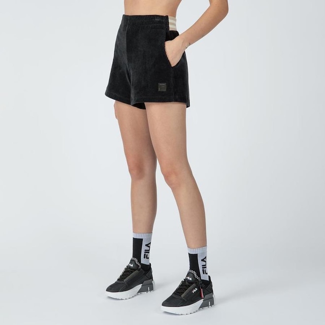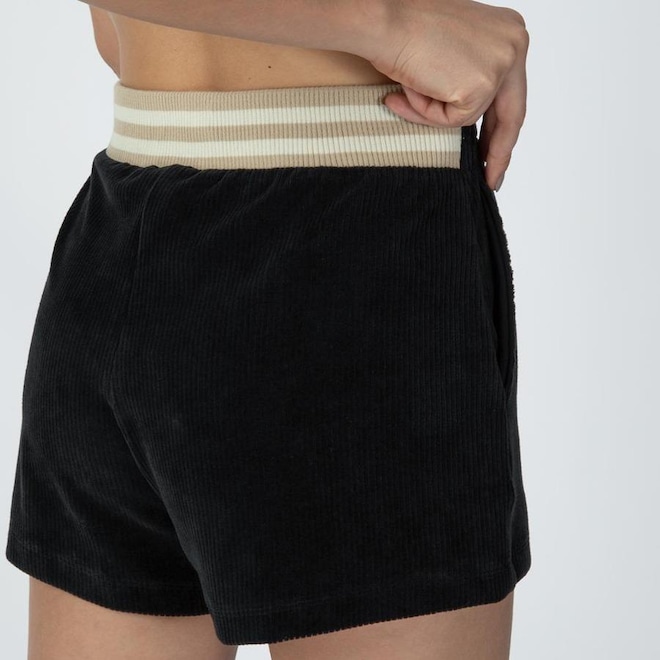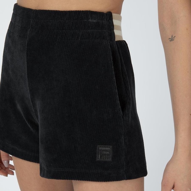 Shorts feminino confeccionado em malha cotelê de algodão, poliéster e elastano. Modelagem regular com comprimento curto. Possui cós frontal tombado com elástico interno e canaleta pespontada, cós traseiro em retilínea listrada, bolsos laterais e patch F-Box aplicado na lateral esquerda próximo à barra. Comprimento total: 35,5 cm. | Entrepernas: 10 cm.ref: M0ZXG7