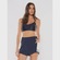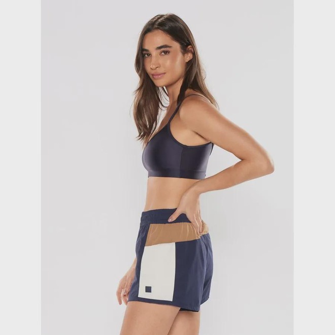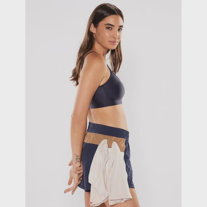 Shorts liso em tecido plano com elastano, recortes com cores contrastantes, bolso lateral, suporte para camiseta, cós com elástico interno pespontado e plaquinha personalizada.