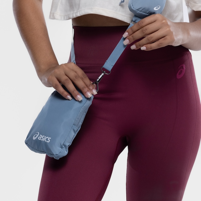 Possui alça tiracolo regulável e removível, o fechamento é em zíper e o bolso interno é amplo.