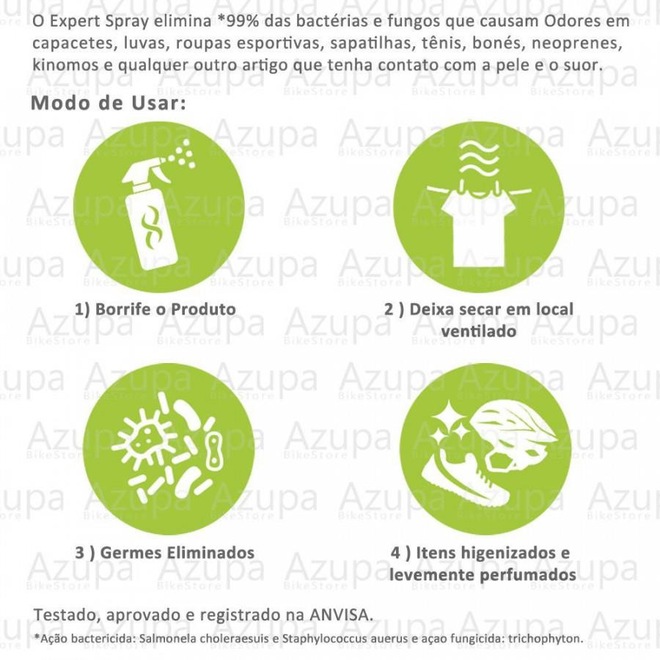 Borrife na sua roupa ou acessório (roupas de ciclismo, bermudas, capacetes, luvas e sapatilhas, etc) até a peça ficar umedecida e deixe secar, de preferência faça isso em um local ventilado e Pronto! Germes e maus odores eliminados, itens higienizados e levemente perfumados!Desta forma você conserva seus equipamentos esportivos e protege sua saúde.