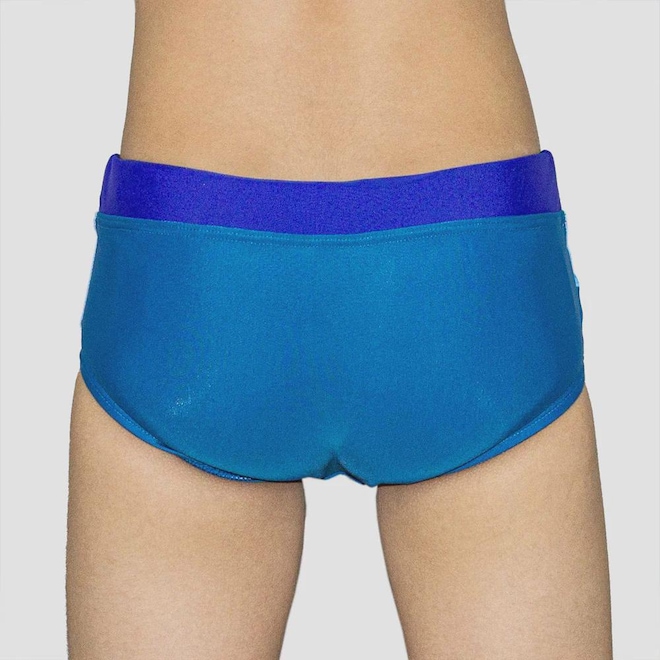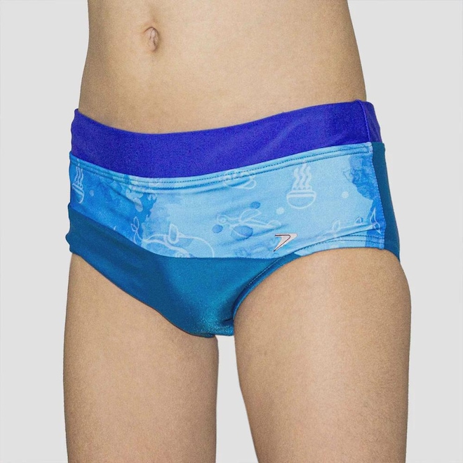 Nome: Sunga Poker Bubbles Infantil Origem: Nacional. Indicado para: Natação Cor: Azul Composição: 85% Poliamida e 15% Elastano. Peso: 50g (Referente ao tamanho 10 anos)