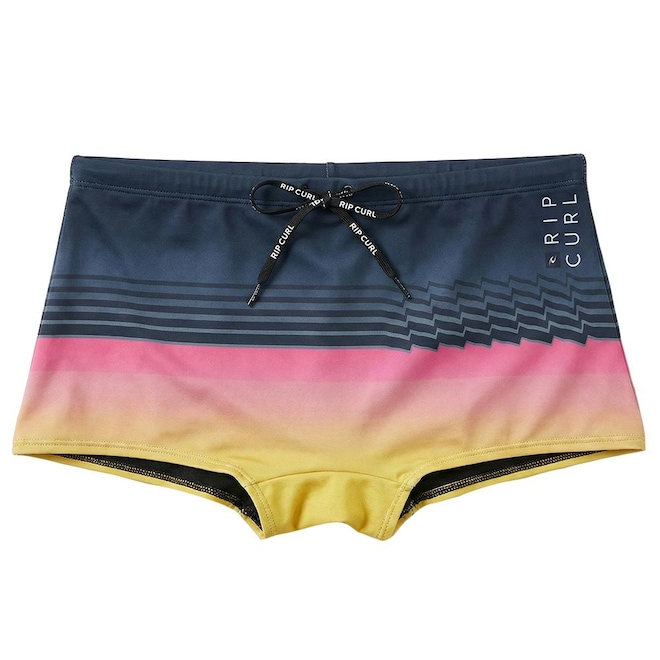 Sunga Rip Curl com proteção UV+50, cadarço personalizado, estampa full print, lateral 22 cm e etiquetas personalizadas.