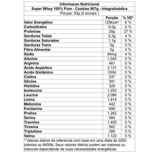Tabela Nutricional - Super Whey 100% Pure - Cookies 907g - Integralmédica