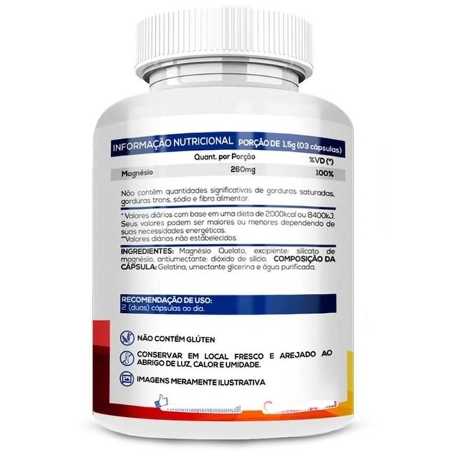 Na maiora das vezes o corpo humano consome mais magnésio do que repoem, o magnésio só é adquirido atráves da alimentação, mas é muito pouco a quantidade de magnésio. Beneficios:- 260 mg de Magnésio - 100% puro. Conservar este produto ao abrigo de luz, calor e umidade, antes e após a abertura da embalagem. Não exceder a recomendação diária de consumo indicada na embalagem. O que contém dentro desse combo / kit?Dentro desse combo / kit contém 3x Magnésio quelato 60 caps - Bionutri