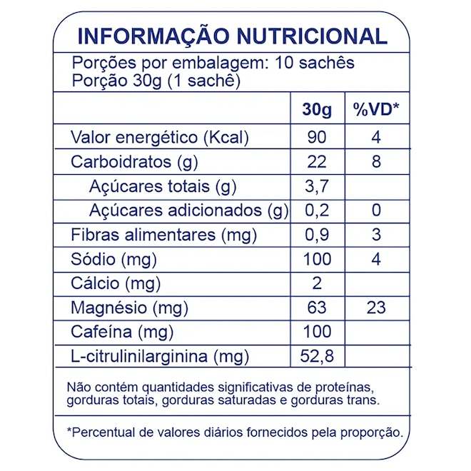 Sabor Pink Lemonade Peso Líquido 30g (sachê individual) Valor Energético Aprox. 84 kcal por porção Carboidratos 18 a 21g (incluindo glicose e maltodextrina) L-Citrulina 3.000mg (vasodilatação e desempenho) Cafeína 100mg (estimulante natural do guaraná) Nitrato 400mg (proveniente da beterraba) Eletrólitos 100mg de sódio, 40mg de magnésio, 40mg de potássio Ingredientes Maltodextrina, água, xarope de maçã, beterraba em pó, L‑citrulina, glicose de milho, limão em pó, guaraná em pó, frutas vermelhas em pó (amora, morango, framboesa), gengibre em pó, acerola em pó, água de coco em pó, acidulante (ácido cítrico), cloreto de sódio, bisglicinato de magnésio, fosfato de potássio, aroma natural de frutas vermelhas e limão, edulcorante glicosídeos de esteviol, conservadores (benzoato de sódio e sorbato de potássio), EDTA cálcio dissódico. Indicação Suplemento energético com ação vasodilatadora e estimulante para atividades físicas intensas Recomendações de uso Consumir 1 sachê 1 hora antes do exercício ou a cada 45 minutos durante treinos longos Alérgenos Sem glúten, sem lactose, sem corantes artificiais Validade 24 meses a partir da data de fabricação (verificar lote) Conservação Armazenar em local seco, fresco e protegido da luz