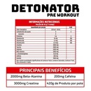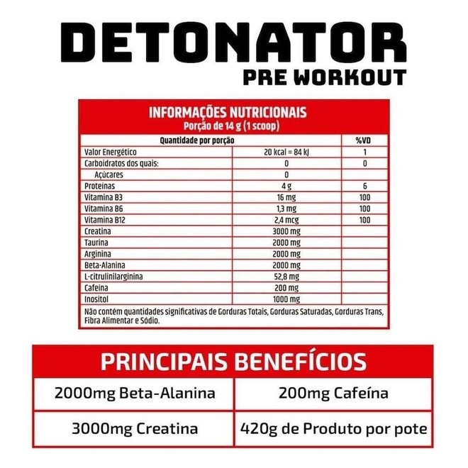O DETONATOR tem baixo teor calórico sendo que cada dose tem apenas 20 kcal. Indicação: Indicado para todos os tipos de praticantes de atividades físicas, desde amadores até profissionais. Principais ativos: Vitaminas B3, B6 e B12: Participam de varias funções no corpo que proporcionam mais energia e menos fadiga. Creatina: Proporciona menos fadiga durante os treinos e aumento do rendimento. Cafeína: Estimulante cerebral que te da mais disposição e te mantém energizado do começo ao fim do treino. Arginina: Proporciona vasodilatação que melhora a irrigação de sangue nos músculos. Beta-Alanina: Retarda a produção de ácido lático durante os exercícios, o que aumenta a resistência muscular. Benefícios: -Mais energia -Mais foco -Menos fadiga -Mais resistência muscular -Melhor recuperação pós treino -Mais vasodilatação Modo de uso: Misture um dosador de 14g do Detonator Pré-Workout em 300ml de água e consuma 30 minutos antes do treino. Resultado: Seus treinos serão mais intensos com mais força e energia. Suas series ficarão mais longas por causa do aumento da resistência muscular. Suas veias ficarão mais grossas e aparentes por causa da vasodilatação. Sua recuperação muscular será mais acelerada, ficando preparado para um próximo treino em menos tempo. Conteúdo: 01 ? Detonator Pré-Workout 420g Precauções: Não exceder a recomendação diária de uso indicada na embalagem.