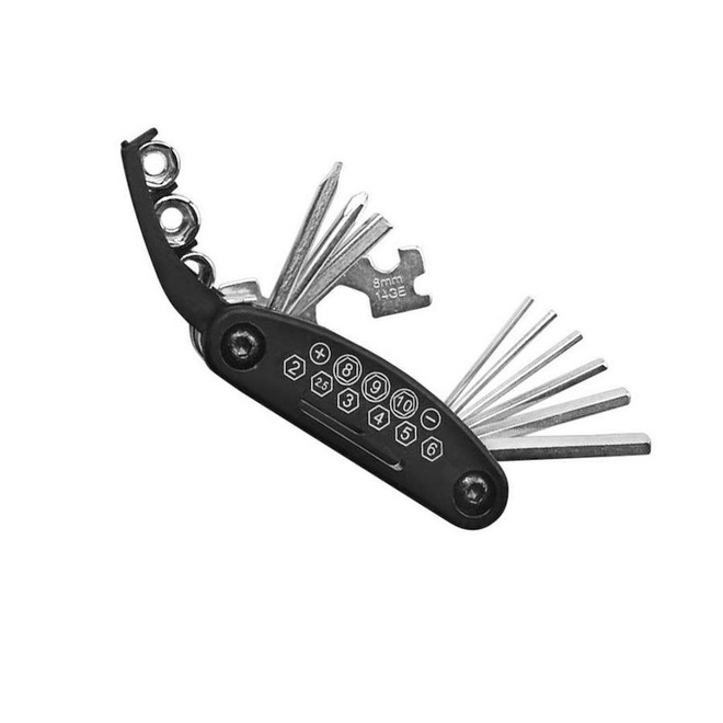 - Canivete de ferramentas com 16 funções: 6 chaves allen (2 mm / 2,5 mm / 3 mm / 4 mm / 5 mm / 6 mm), 3 soquetes (8 mm / 9 mm / 10 mm), 3 chaves de boca (8 mm / 10 mm / 15 mm), 1 chave de soquete, 1 chave philips, 1 chave de fenda.