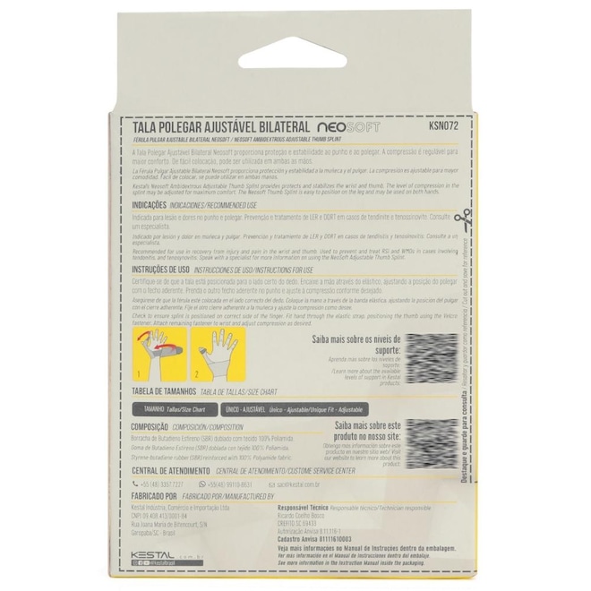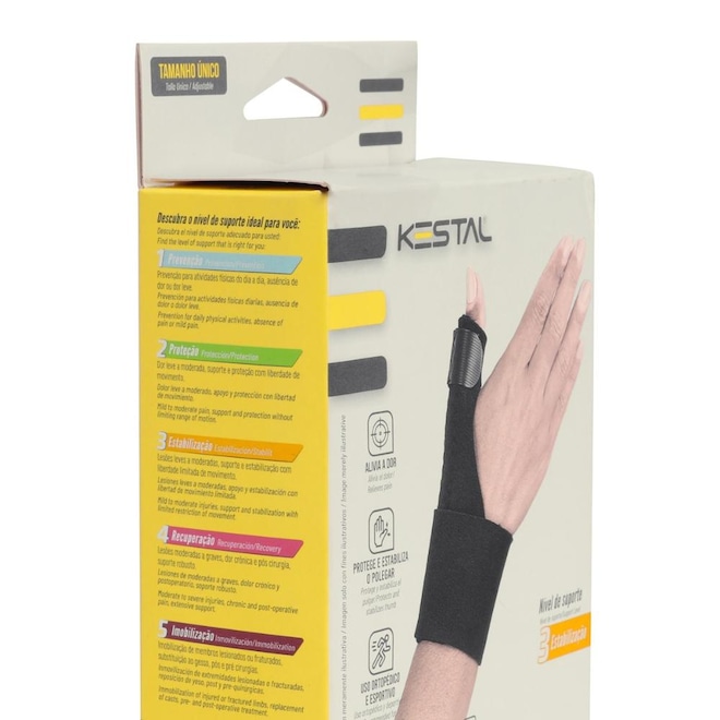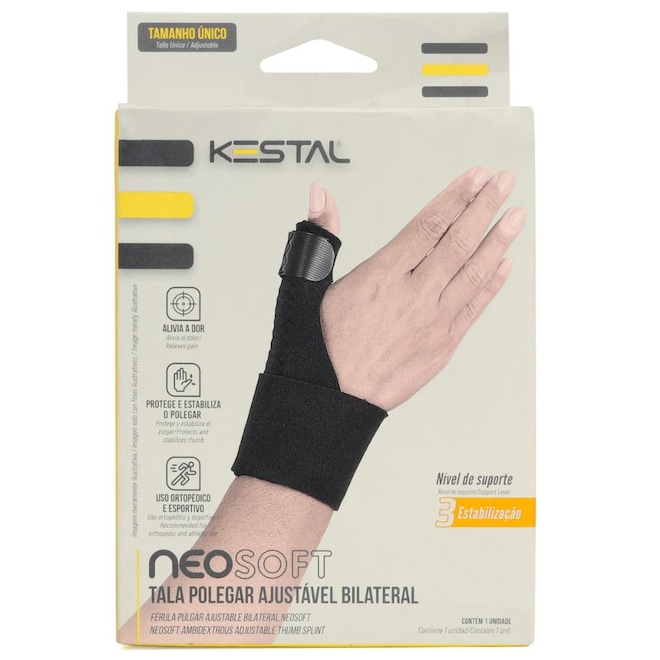 A Kestal é uma marca de acessórios fitness e ortopédicos focada em oferecer produtos modernos, de alta performance e qualidade que possibilitem a prática de exercícios físicos em qualquer lugar, agindo como complemento ou substituto da academia. A Tala Polegar Kestal Ajustável Bilateral Neosoft Preta proporciona proteção e estabilidade ao punho e ao polegar. Seu uso é indicado tanto na prevenção quanto no tratamento de condições como tendinite, tenossinovite, LER e DORT.