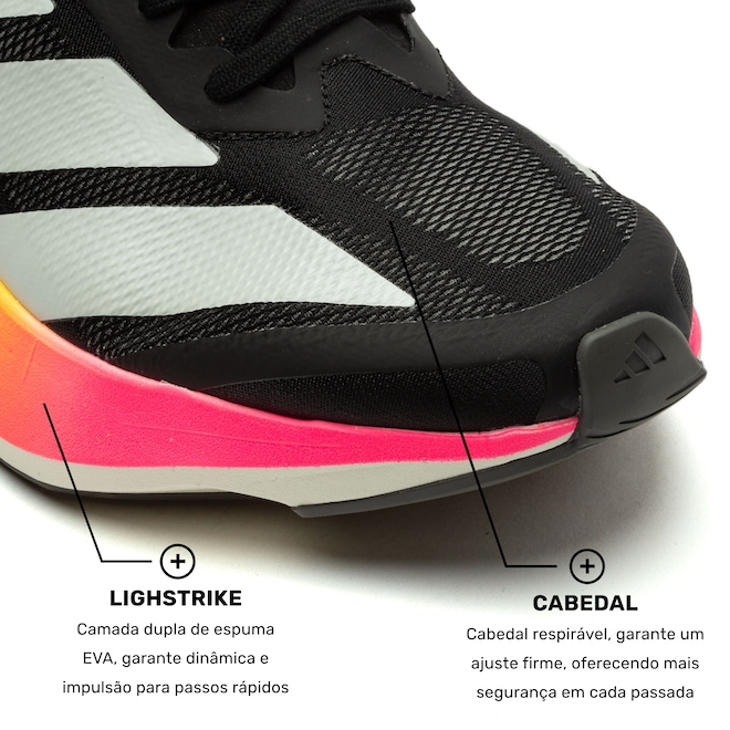 Com produção nacional, ele combina tecnologias premium e excelente custo-benefício. Inspirado na linha Adizero Running, esse modelo traz um cabedal respirável feito de poliamida e poliéster, oferecendo um ajuste seguro e confortável para cada passada.