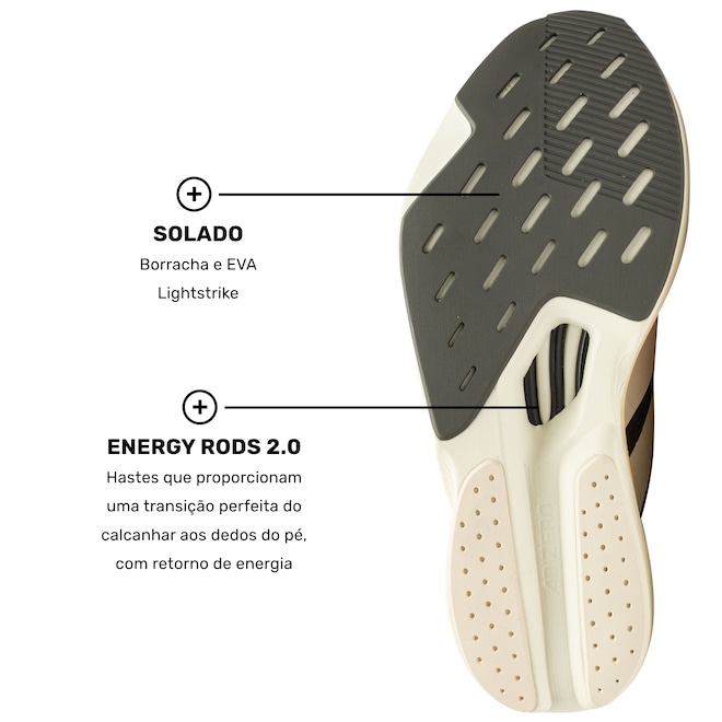 Com duas camadas de espuma Lightstrike, o tênis garante uma dinâmica e impulsão excepcionais, enquanto as Energy Rods 2.0 proporcionam uma transição perfeita do calcanhar aos dedos, maximizando o retorno de energia e minimizando o gasto energético.