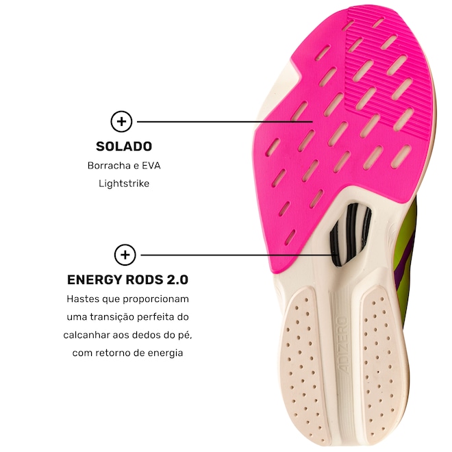 Com duas camadas de espuma Lightstrike, o tênis garante uma dinâmica e impulsão excepcionais, enquanto as Energy Rods 2.0 proporcionam uma transição perfeita do calcanhar aos dedos, maximizando o retorno de energia e minimizando o gasto energético.