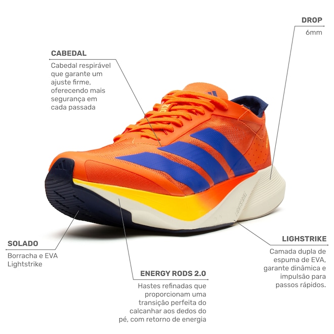 Com produção nacional, ele combina tecnologias premium e excelente custo-benefício. Inspirado na linha Adizero Running, esse modelo traz um cabedal respirável feito de poliamida e poliéster, oferecendo um ajuste seguro e confortável para cada passada.