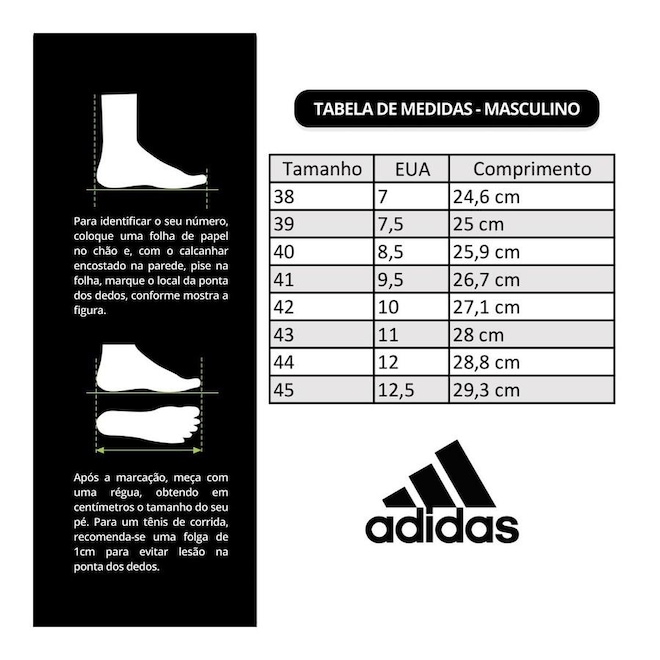 Reforço acolchoadoAltura do Cano Cano Curto Estampa do Logo Estampado no Cabedal Faixa Etária Adulto Garantia do Fornecedor Contra Defeito de Fabricação Conteúdo da Embalagem 1 Par SAC do Fornecedor ADIDAS: Brasil 0800 8 234 327 - Grande São Paulo (11) 2161 2961 Tipo de Amarração Cadarço