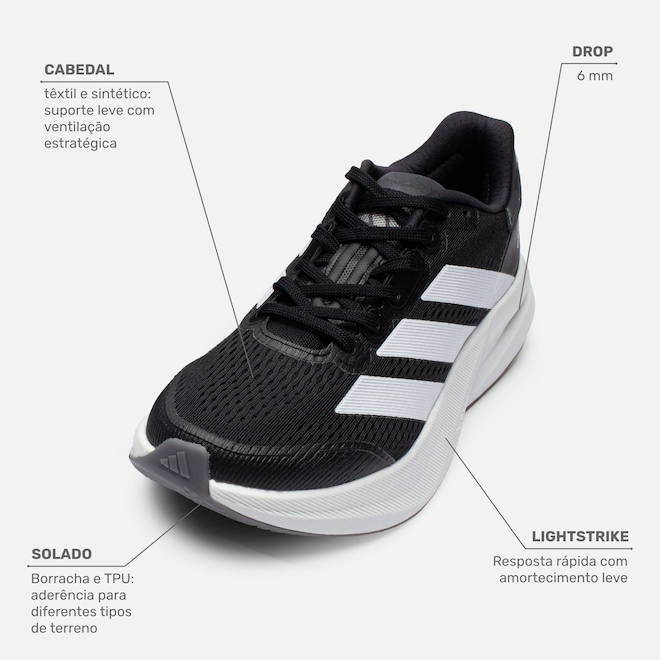 Mesh (Fibras em Malha com Tramas Abertas)Entressola EVA Solado Borracha Material do Forro Têxtil Lingueta Acolchoada Palmilha Forrada Contraforte Suporte acolchoado Tipo de Amarração Cadarço Estampa do Logo Estampado no Cabedal Garantia do Fornecedor Contra Defeito de Fabricação Conteúdo da Embalagem 1 Par SAC do Fornecedor ADIDAS: Brasil 0800 8 234 327 - Grande São Paulo (11) 2161 2961 Pisada Neutra Terreno Indicado Academia/Esteira