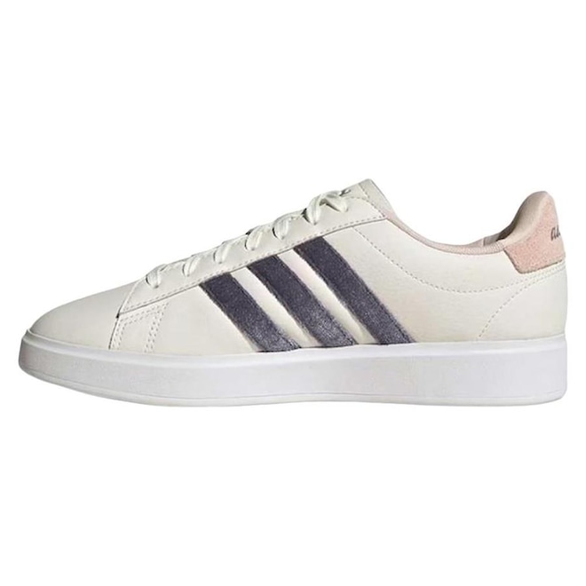 Está em busca de um tênis atemporal, que combina com diversos looks e alinha conforto e beleza? Então o clássico Tênis Adidas Grand Court é o que você busca. O modelo é fabricado com pelo menos 50% de conteúdo reciclado, demonstrando o compromisso da marca com a sustentabilidade. O solado de borracha oferece mais durabilidade e tração. O destaque do produto fica por conta das icônicas listras da Adidas, que ganham vida na cor lilás no material camurça. Dando um detalhe delicado e de sofisticação. Além disso, a cor Off White é elegante e versátil. Com este produto você terá mais versatilidade em seu guarda-roupa. Referência: ID4524