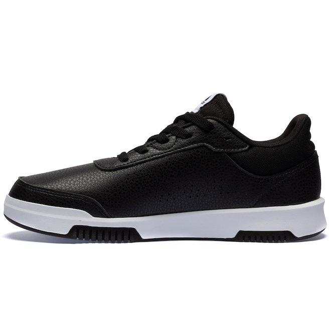 Possui cabedal em material sintético, entressola emborrachada e lingueta flexível.