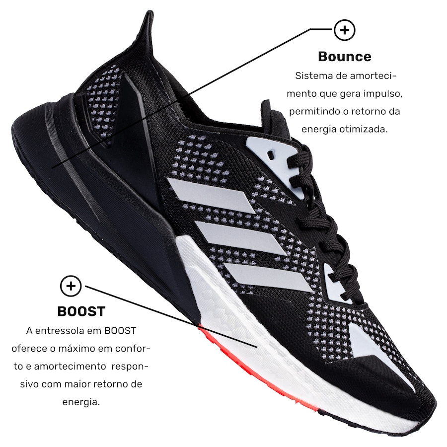 A entressola agrega a parceria BOOST™ no antepé e Bounce no calcanhar para um bombástico equilíbrio na performance da corredora. Já o padrão de solado do X9000 L3 foi projetado através de estudos gerados por computador para garantir tração adaptável multissuperfície.