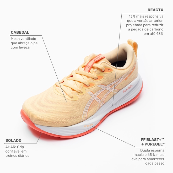 Já o PureGEL™ oferece absorção extra de choques, tornando a corrida mais fluida e confortável.