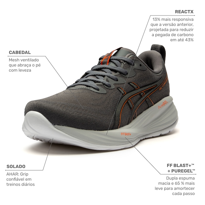 A entressola em EVA com a avançada tecnologia FF BLAST+™ ECO proporciona amortecimento responsivo e transições suaves, reduzindo o impacto em cada passada. Já o PureGEL™ oferece absorção extra de choques, tornando a corrida mais fluida e confortável.