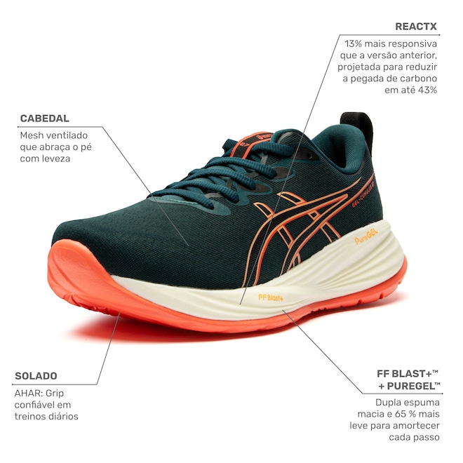A entressola em EVA com a avançada tecnologia FF BLAST+™ ECO proporciona amortecimento responsivo e transições suaves, reduzindo o impacto em cada passada. Já o PureGEL™ oferece absorção extra de choques, tornando a corrida mais fluida e confortável.