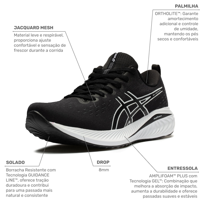 Seu cabedal em mesh proporciona respirabilidade e leveza, enquanto a entressola em EVA e as tecnologias de amortecimento Gel e Amplifoam garantem uma corrida suave e responsiva.