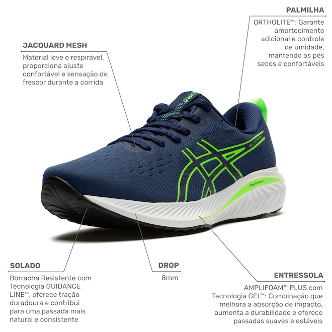 Seu cabedal em mesh proporciona respirabilidade e leveza, enquanto a entressola em EVA e as tecnologias de amortecimento Gel e Amplifoam garantem uma corrida suave e responsiva.
