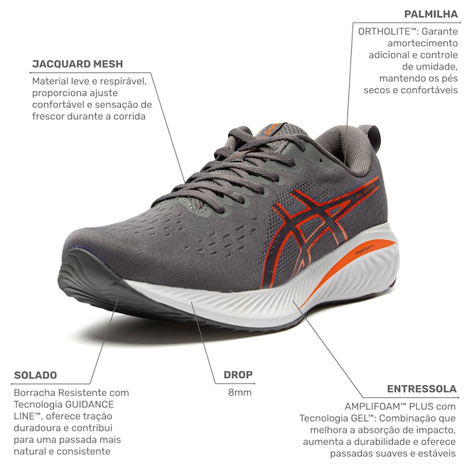 Seu cabedal em mesh proporciona respirabilidade e leveza, enquanto a entressola em EVA e as tecnologias de amortecimento Gel e Amplifoam garantem uma corrida suave e responsiva.