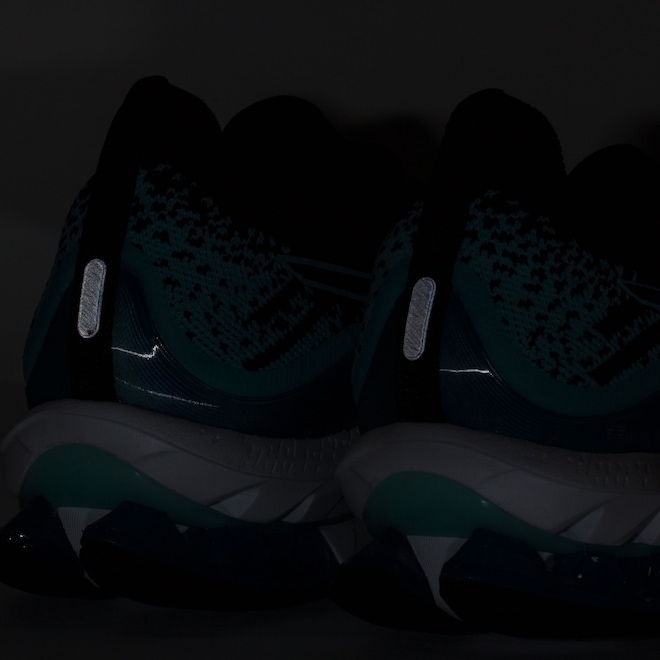 O cabedal (parte superior do tênis) é desenvolvido com a leveza e respirabilidade da malha knit com colar do calcanhar e contraforte acolchoados que ajudam a diminuir o desconforto do atrito de contato.