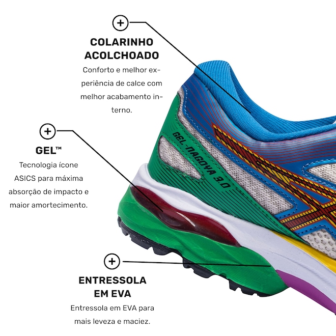 Já a entressola em EVA otimizada com a melhor tecnologia que a marca oferece na atualidade, Sistema de Amortecimento em Gel base de silicone, colocado em locais estratégicos para absorção de impacto, garantindo uma corrida confortável, estável e segura, isso significa mais equilíbrio na postura e menos desperdício de energia.
