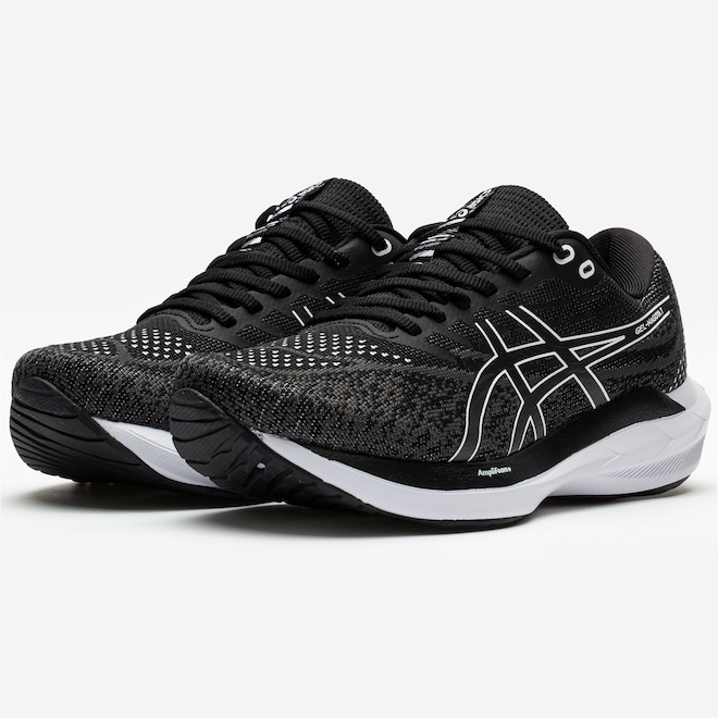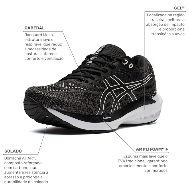 A entressola com tecnologia AMPLIFOAM™ PLUS eleva a experiência de amortecimento, sendo mais leve e eficiente do que o EVA tradicional, enquanto a icônica tecnologia GEL™, posicionada estrategicamente no calcanhar e na articulação do dedão, absorve os impactos e protege o corpo, reduzindo a fadiga muscular e permitindo corridas mais longas e seguras.