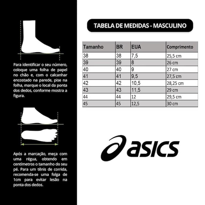 AcolchoadaPalmilha Forrada Contraforte Suporte acolchoado Tipo de Amarração Cadarço Estampa do Logo Estampado no Cabedal Garantia do Fornecedor Contra Defeito de Fabricação Conteúdo da Embalagem 1 Par SAC do Fornecedor ASICS: 0800-722-7427 ou através do e-mail fale.conosco@asics.com Pisada Neutra Terreno Indicado Academia/Esteira