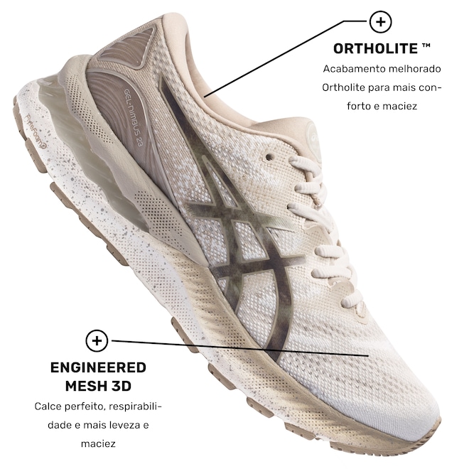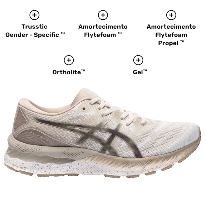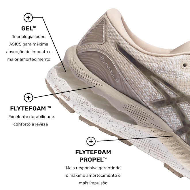 O Asics Gel-Nimbus 23 com seu design reformulado chega para conquistar você corredora de longa ou curta distância. É amortecimento que você quer?Engineered Mesh: Malha que faz uso de perfurações firmes, porém maleáveis, para um cabedal ainda mais flexível e respirável.AHAR® (High Abrasion Resistant Rubber): Tecnologia que integra o sistema Trusstic, placa anti-torção e a tecnologia Guidance Line. Com uma construção melhorada, proporciona passadas mais estáveis, mantendo a estrutura da entressola para um melhor direcionamento da passada e performance do corredor.Sistema de Amortecimento em Gel: Gel com base de silicone, colocado em locais estratégicos para absorção de impacto.FlyteFoam™: Mais leve que o EVA tradicional, combina leveza, amortecimento e resposta rápida aos movimentos.Flytefoam™ Propel Formulação patenteada extremamente resiliente, leve e confortável para garantir melhor retorno de energia, durabilidade e performance.Trusstic Gender-specific: Proporciona maior estabilidade diferenciada por gênero e evita o movimento.Ortholite: Garante maior conforto, respirabilidade e um sistema antimicrobial.Encare seus desafios mais difíceis, com esse tênis para corrida Asics. Corra, ele está te esperando no Centauro!