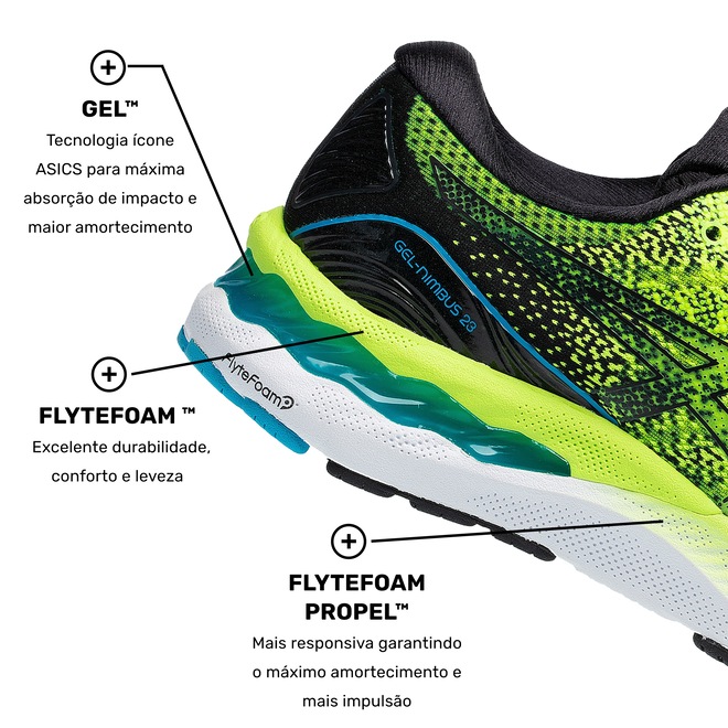 O Asics Gel-Nimbus 23 com seu design reformulado chega para conquistar você corredor de longa ou curta distância. É amortecimento que você quer?Engineered Mesh Malha que faz uso de perfurações firmes, porém maleáveis, para um cabedal ainda mais flexível e respirável.AHAR® (High Abrasion Resistant Rubber) Tecnologia que integra o sistema Trusstic, placa anti-torção e a tecnologia Guidance Line. Com uma construção melhorada, proporciona passadas mais estáveis, mantendo a estrutura da entressola para um melhor direcionamento da passada e performance do corredor.Sistema de Amortecimento em Gel: Gel com base de silicone, colocado em locais estratégicos para absorção de impacto.FlyteFoam™: Mais leve que o EVA tradicional, combina leveza, amortecimento e resposta rápida aos movimentos.Flytefoam™ Propel Formulação patenteada extremamente resiliente, leve e confortável para garantir melhor retorno de energia, durabilidade e performance.Trusstic Gender-specific: Proporciona maior estabilidade diferenciada por gênero e evita o movimento.Ortholite: Garante maior conforto, respirabilidade e um sistema antimicrobial.Encare seus desafios mais difíceis, com esse tênis para corrida Asics. Corra, ele está te esperando na Centauro!