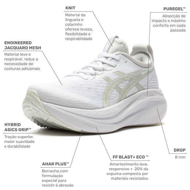 Já a tecnologia PureGel trabalha para absorver impactos de forma eficaz, oferecendo uma experiência de corrida extremamente suave e fluida.