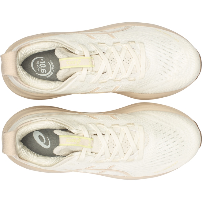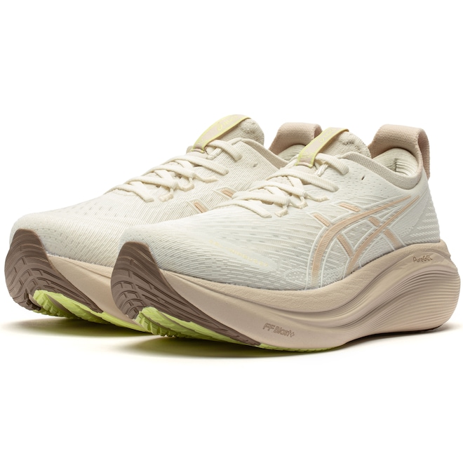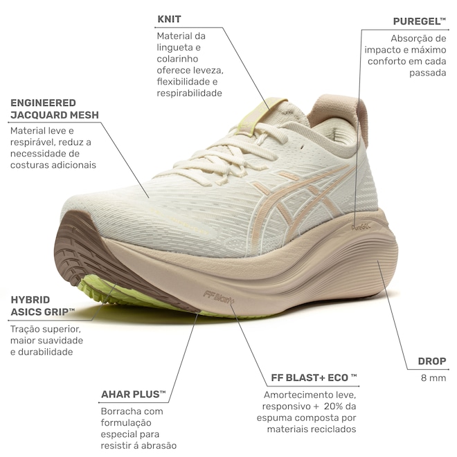 Seu solado é equipado com a inovadora FF Blast™ Plus Eco, uma espuma 20% mais macia e responsiva em comparação com versões anteriores, produzida com pelo menos 24% de materiais de base biológica, reforçando o compromisso da ASICS com práticas sustentáveis.